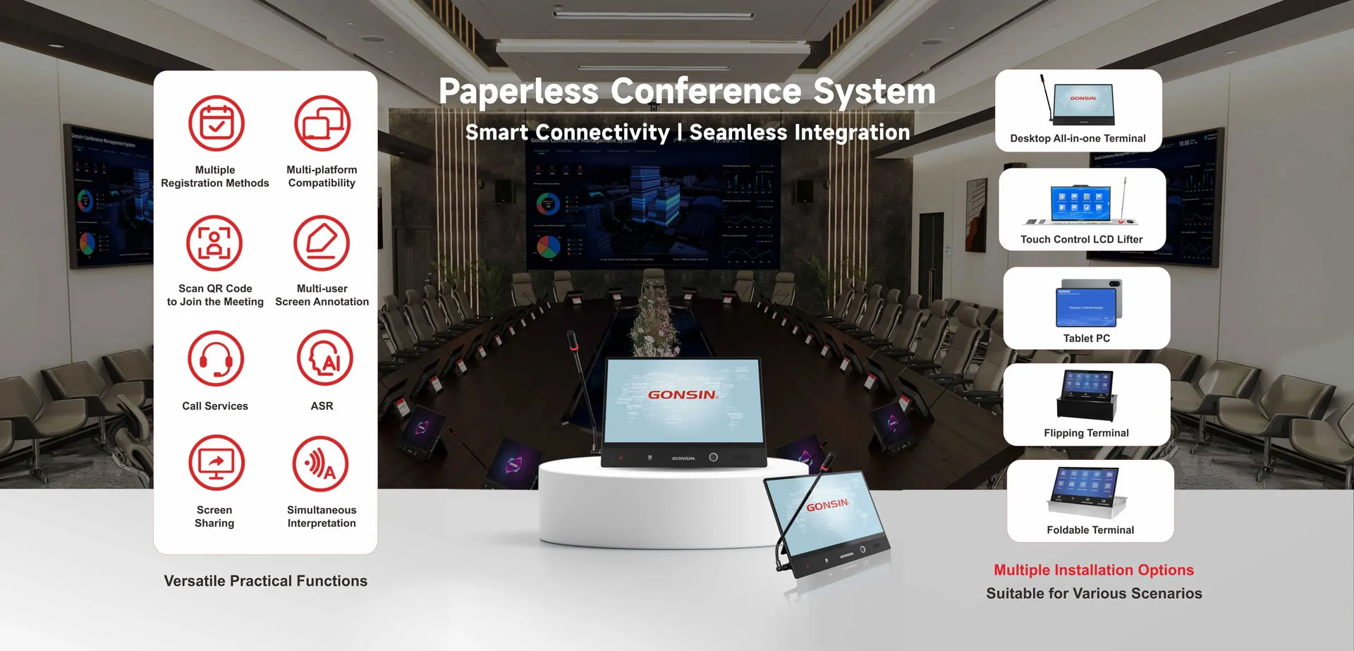 GONSIN Paperless Audio Digital Conference System is a unique paperless multimedia conference room audio video solution and it can realize paperless multimedia function through the combination of paperless terminals and conference terminals. As a leading provider of paperless conference systems in China, GONSIN offers advanced technology to streamline modern meeting environments.